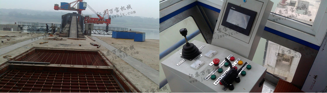 墩柱式装船机,具有臂架俯仰及伸缩、供料皮带机、可伸缩和旋转溜筒、尾车、除尘、供电和控制电缆卷筒等机构和装置。臂架工作俯仰、臂架伸缩、供料皮带机、溜筒伸缩等各机构既可单独运行,也可根据需要组合联动。